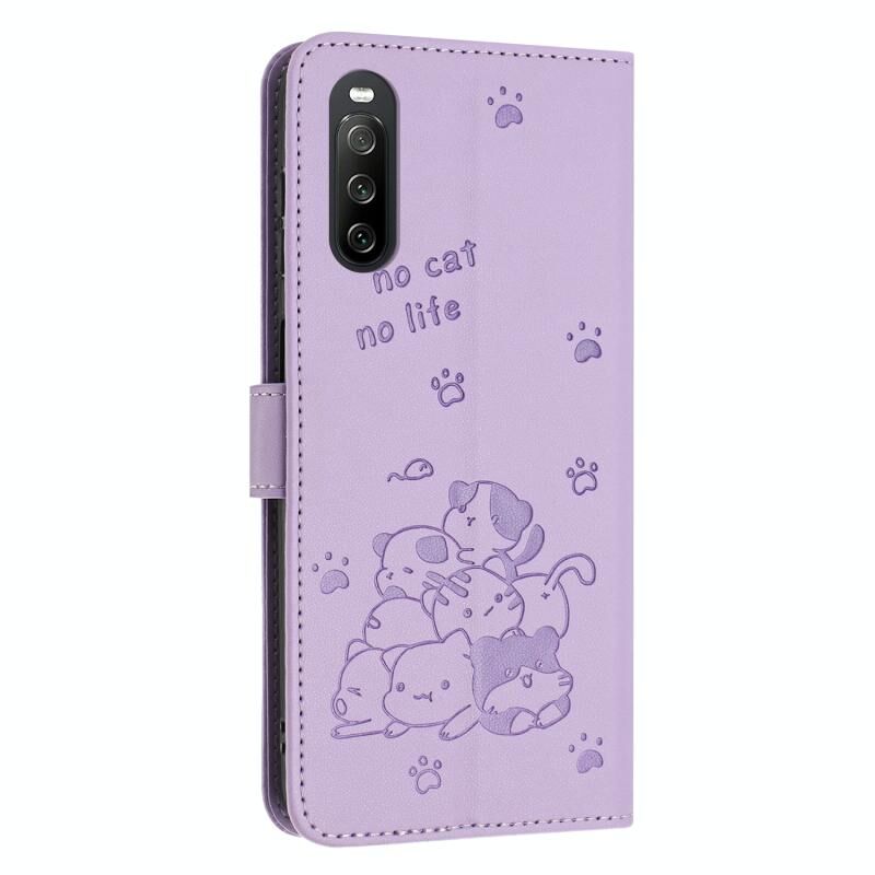 Θήκη δερμάτινη για Sony Xperia 10 IV με ανάγλυφο γατάκι και λουρί (Μωβ)