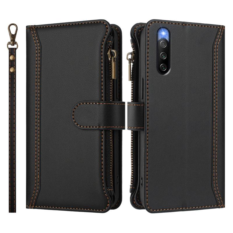 For Sony Xperia 10 IV Magnetic Closure 9 Card Slots Zipper Leather Case with Hand Strap(Black)