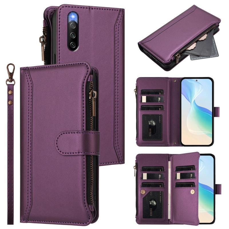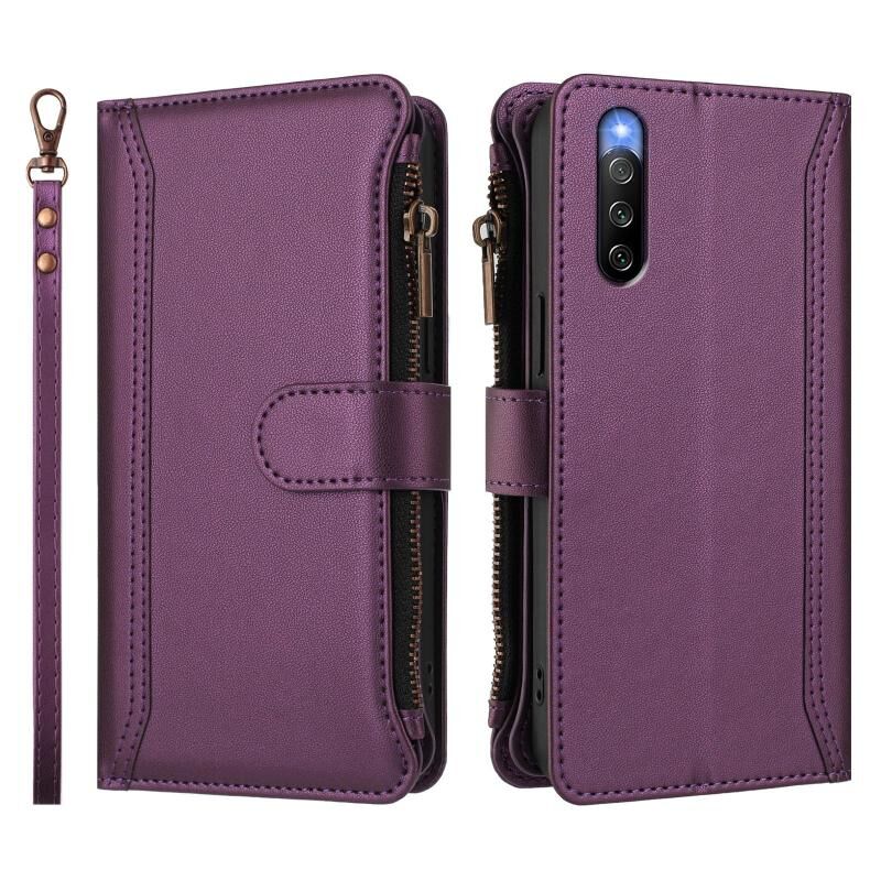 For Sony Xperia 10 IV Magnetic Closure 9 Card Slots Zipper Leather Case with Hand Strap(Purple)