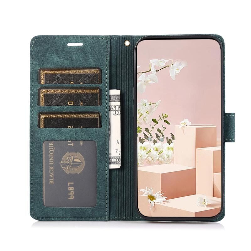 3. Θήκη πορτοφολιού με κάρτες: Συνδυασμός πορτοφολιού και θήκης κινητού τηλεφώνου, με υποδοχές για κάρτες ταυτότητας και πιστωτικές κάρτες, μπορεί να χρησιμοποιηθεί ως πορτοφόλι για να κρατάει πολλές πιστωτικές κάρτες, μετρητά, ταυτότητα και χρήματα.