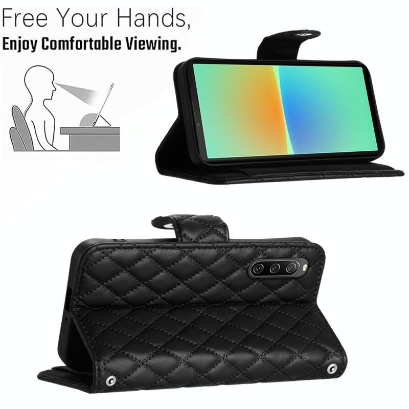 Για Sony Xperia 10 IV Rhombic Texture Flip δερμάτινη θήκη τηλεφώνου με μακρύ κορδόνι (μαύρο)