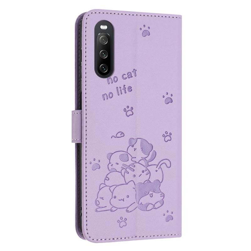 Θήκη δερμάτινη για Sony Xperia 10 V 2023 με ανάγλυφο σχέδιο γατάκι και κορδόνι (Μωβ)