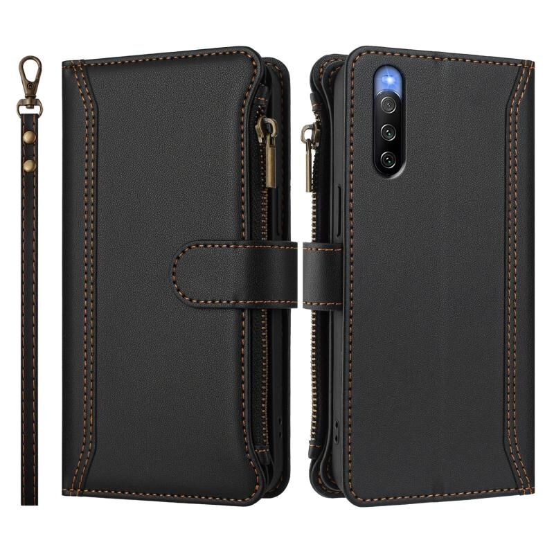 For Sony Xperia 10 V 2023 Magnetic Closure 9 Card Slots Zipper Leather Case with Hand Strap(Black)