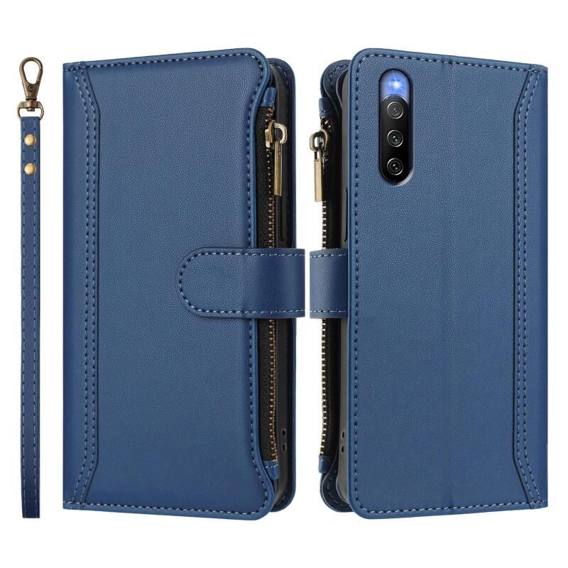 For Sony Xperia 10 V 2023 Magnetic Closure 9 Card Slots Zipper Leather Case with Hand Strap(Dark Blue)