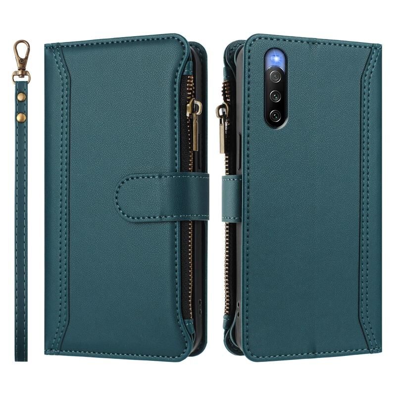 For Sony Xperia 10 V 2023 Magnetic Closure 9 Card Slots Zipper Leather Case with Hand Strap(Dark Green)