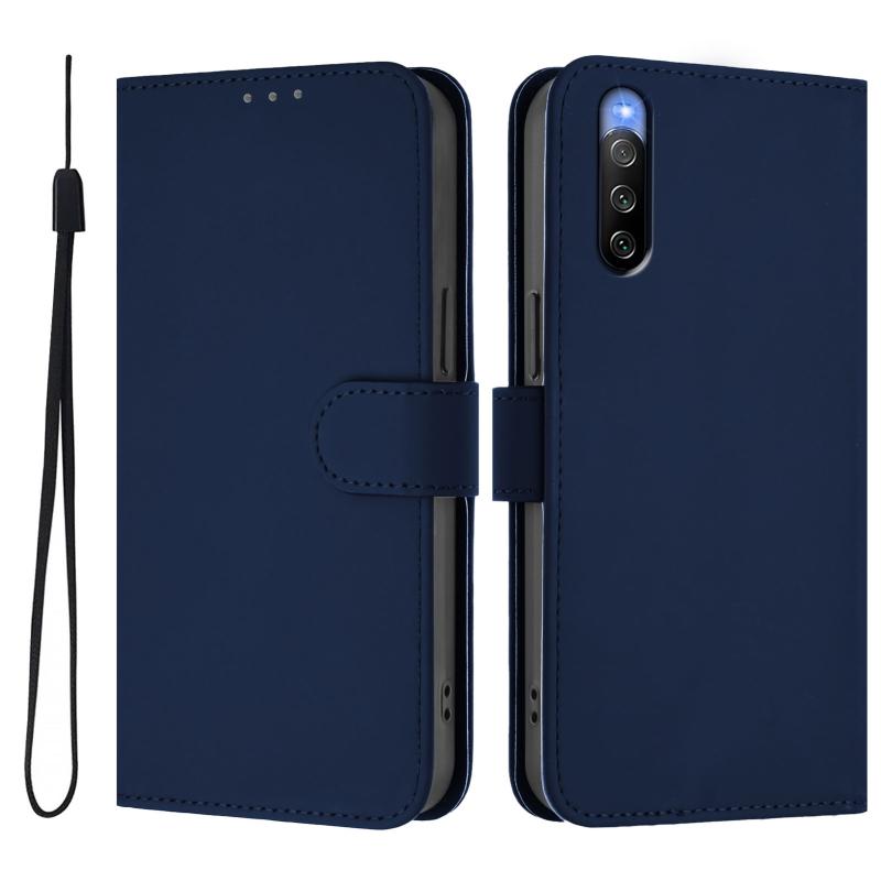 For Sony Xperia 10 V 2023 Skin Feel Solid Color Leather Phone Case with Lanyard(Navy Blue)