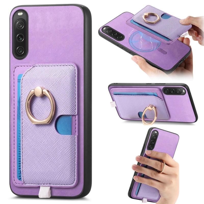For Sony Xperia 10 V Retro Cross Leather Ring Side Insert Card Bag MagSafe Phone Case(Purple)