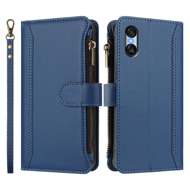 For Sony Xperia 10 VI 2024 Magnetic Closure 9 Card Slots Zipper Leather Case with Hand Strap(Dark Blue)