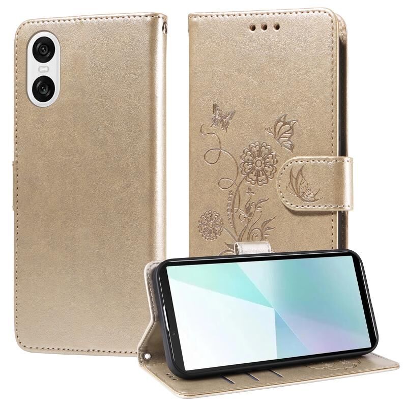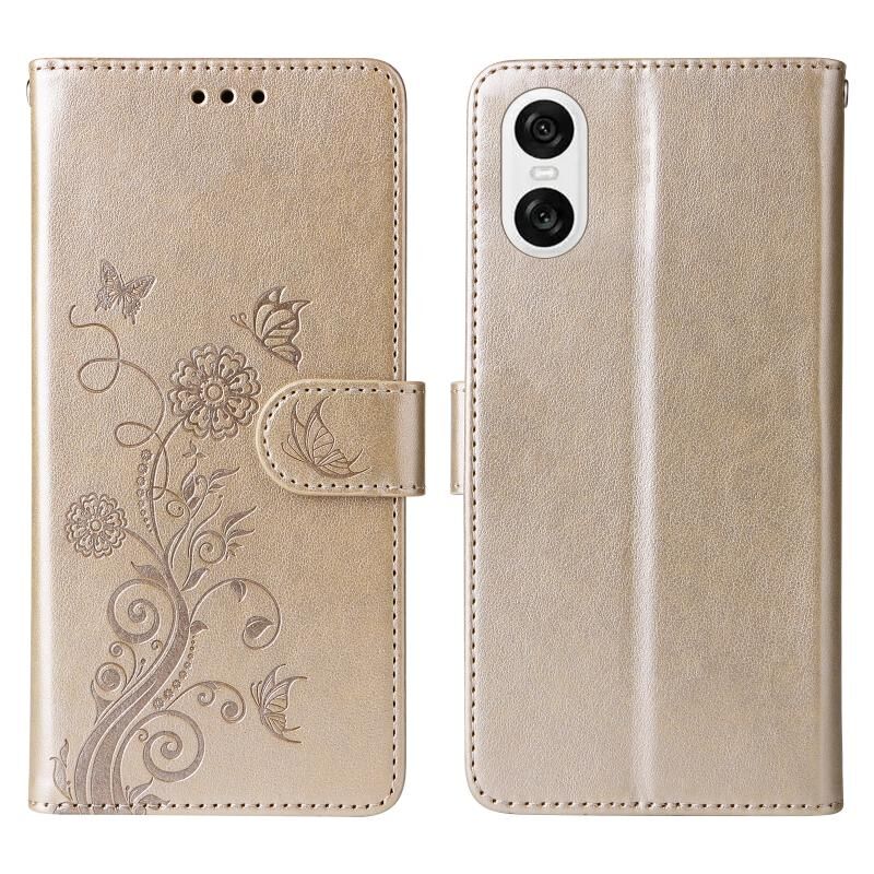 Θήκη τηλεφώνου δερμάτινη με ανάγλυφα λουλούδια πεταλούδας για Sony Xperia 10 VI (Χρυσό)