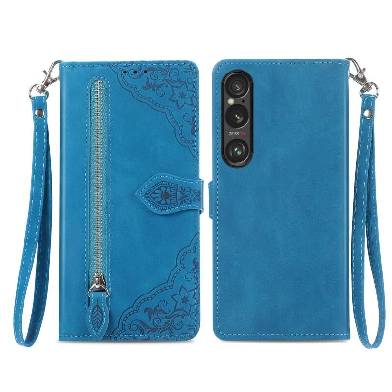 Για Sony Xperia 10 VI ανάγλυφο λουλούδι φερμουάρ δερμάτινη θήκη τηλεφώνου (μπλε)