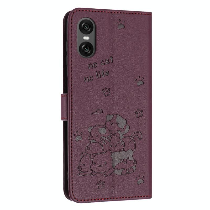 Θήκη δερμάτινη για Sony Xperia 10 VI με ανάγλυφο γατάκι και κορδόνι (Μωβ)