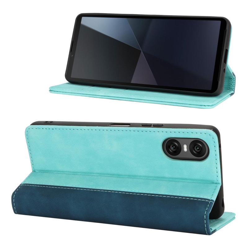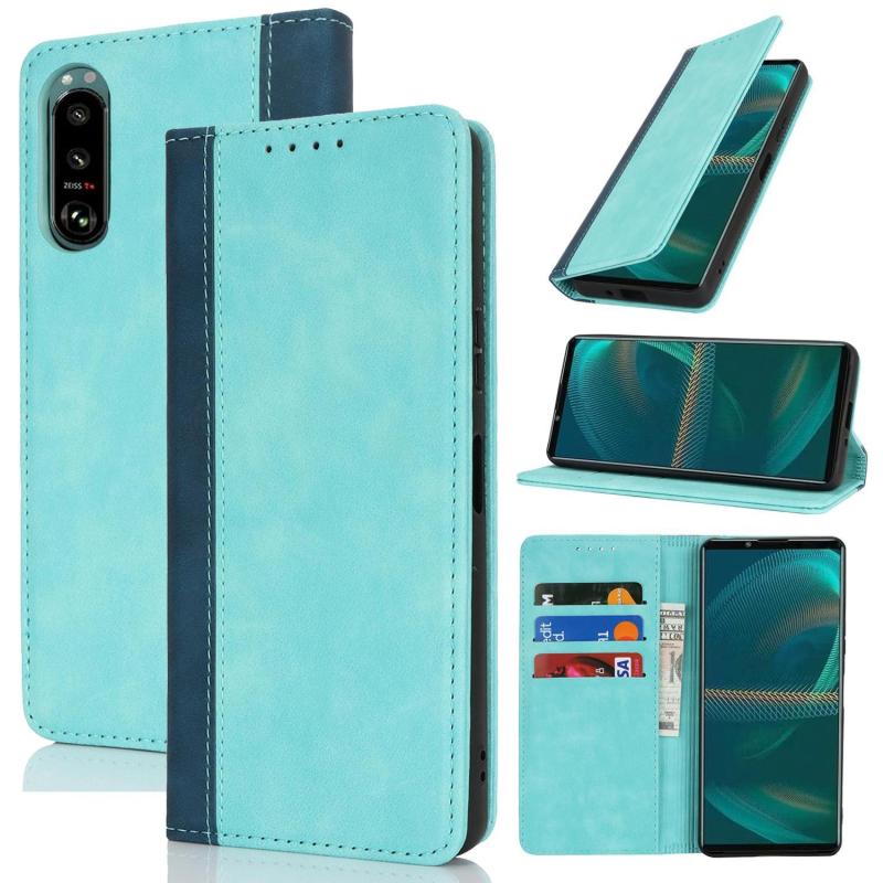 For Sony Xperia 5 III Calf Texture Color Stitching Leather Phone Case(Light Blue Dark Blue)