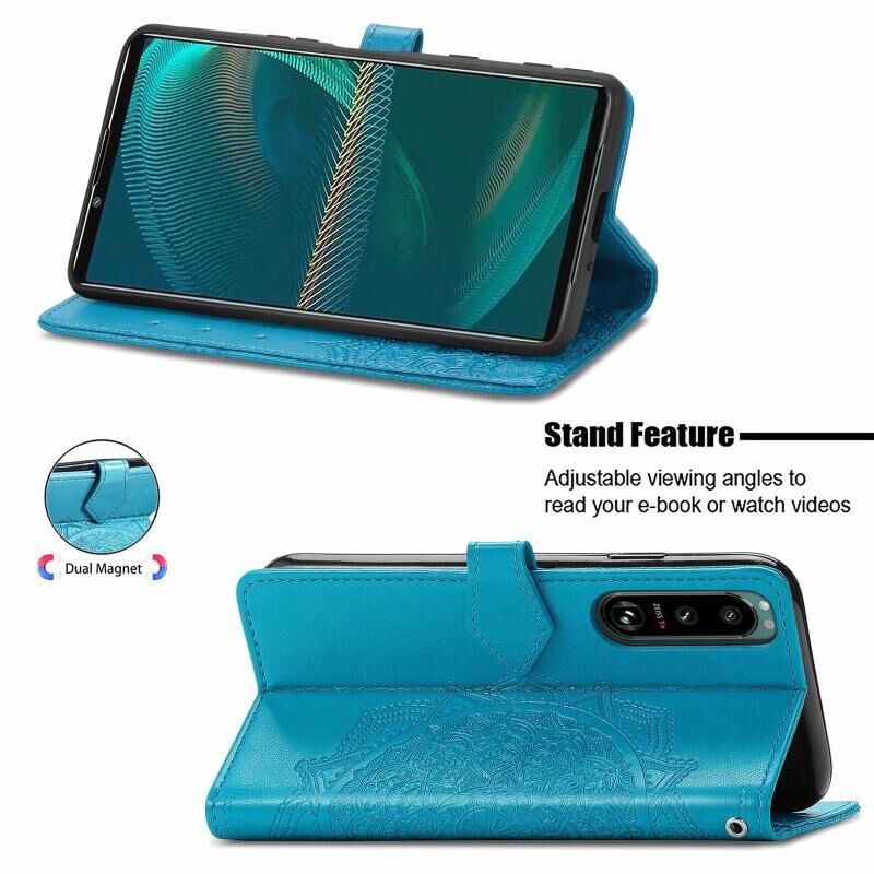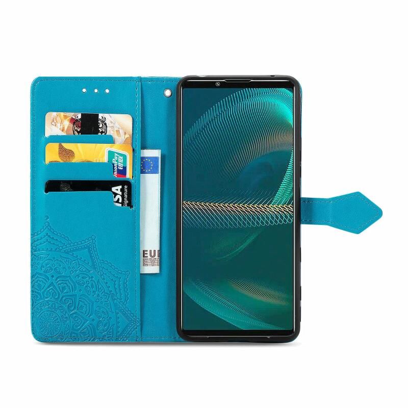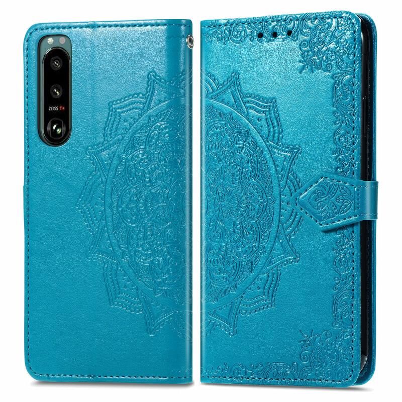 Για Sony Xperia 5 III Mandala λουλούδι ανάγλυφο οριζόντια Flip δερμάτινη θήκη με στήριγμα / υποδοχή για κάρτες / πορτοφόλι / κορδόνι (μπλε)