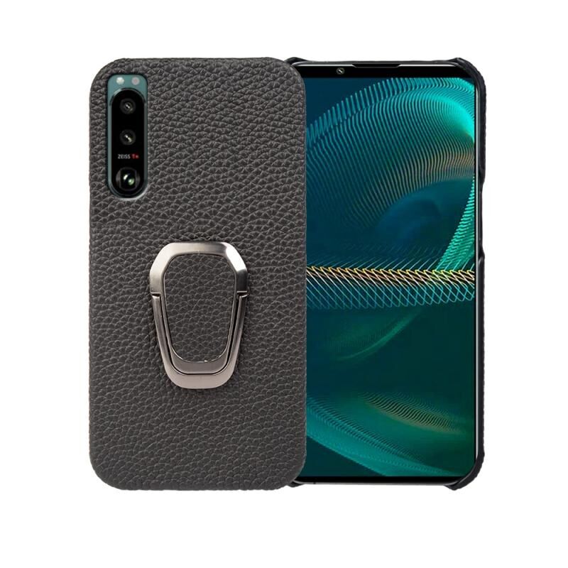 Θήκη τηλεφώνου για Sony Xperia 5 III με δακτύλιο στήριξης, γνήσιο δέρμα με υφή λύτσι (Μαύρο)