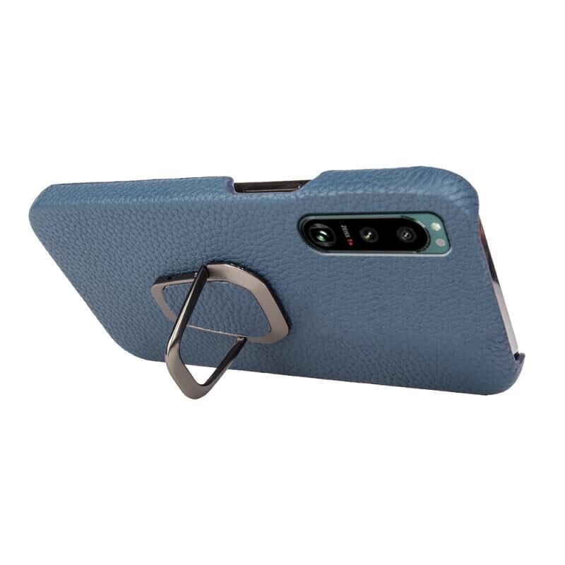 Θήκη τηλεφώνου για Sony Xperia 5 III με δακτύλιο στήριξης, γνήσιο δέρμα με υφή λύτσι (Μαύρο)