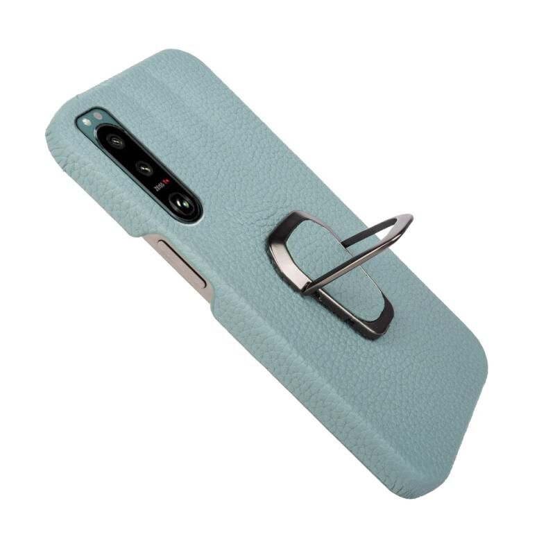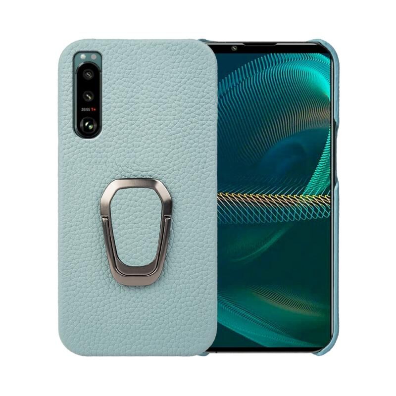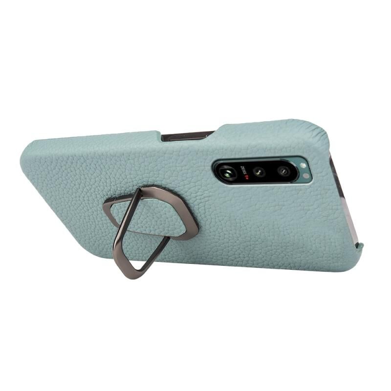 Θήκη τηλεφώνου για Sony Xperia 5 III με δακτύλιο στήριξης, γνήσιο δέρμα με υφή λύτσι (Κυανό)
