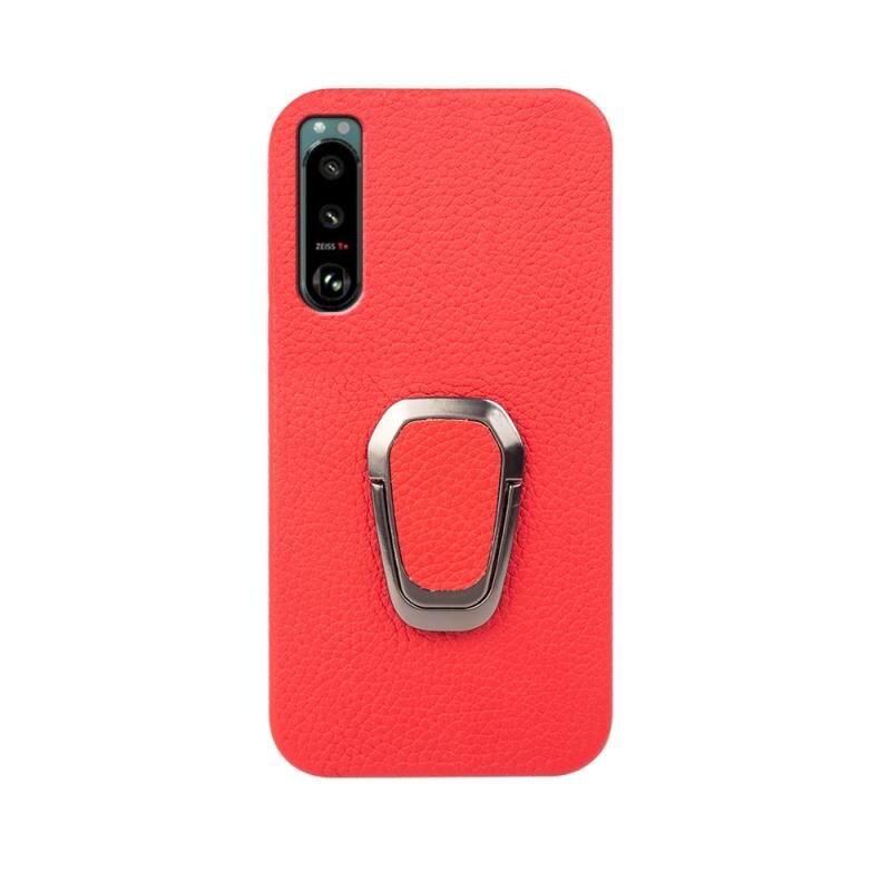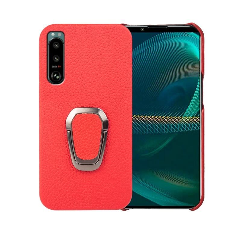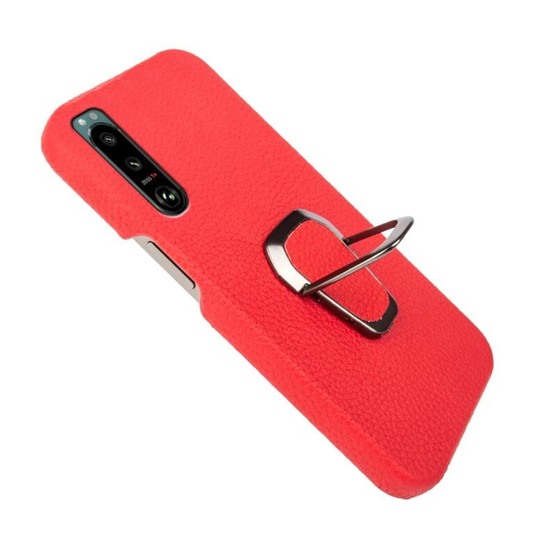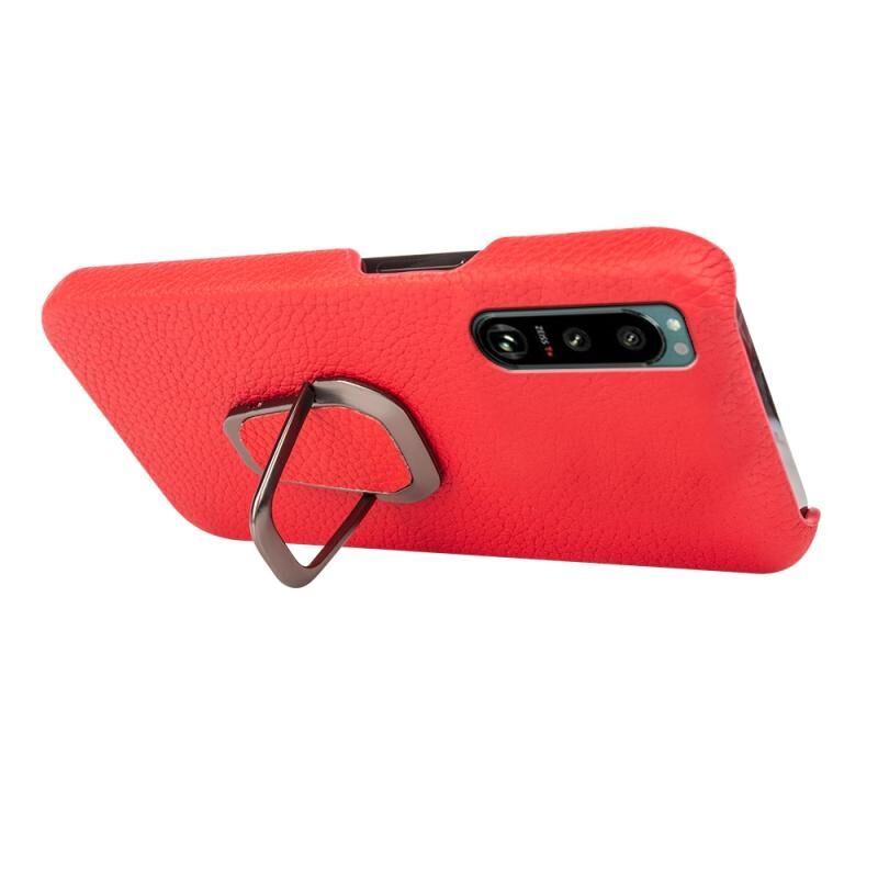 Θήκη τηλεφώνου για Sony Xperia 5 III με δακτύλιο στήριξης, γνήσιο δέρμα με υφή λύτσι (Μαύρο)