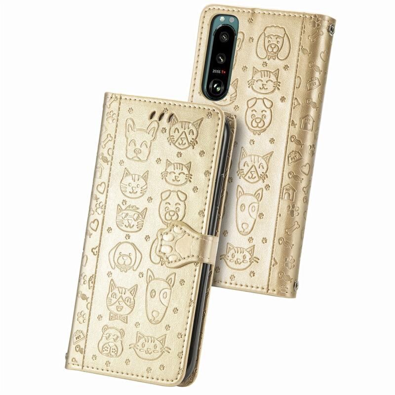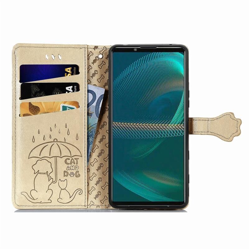 Θήκη τηλεφώνου από δέρμα με ανάγλυφο σχέδιο γάτας και σκύλου για Sony Xperia 5 IV (Κίτρινο)