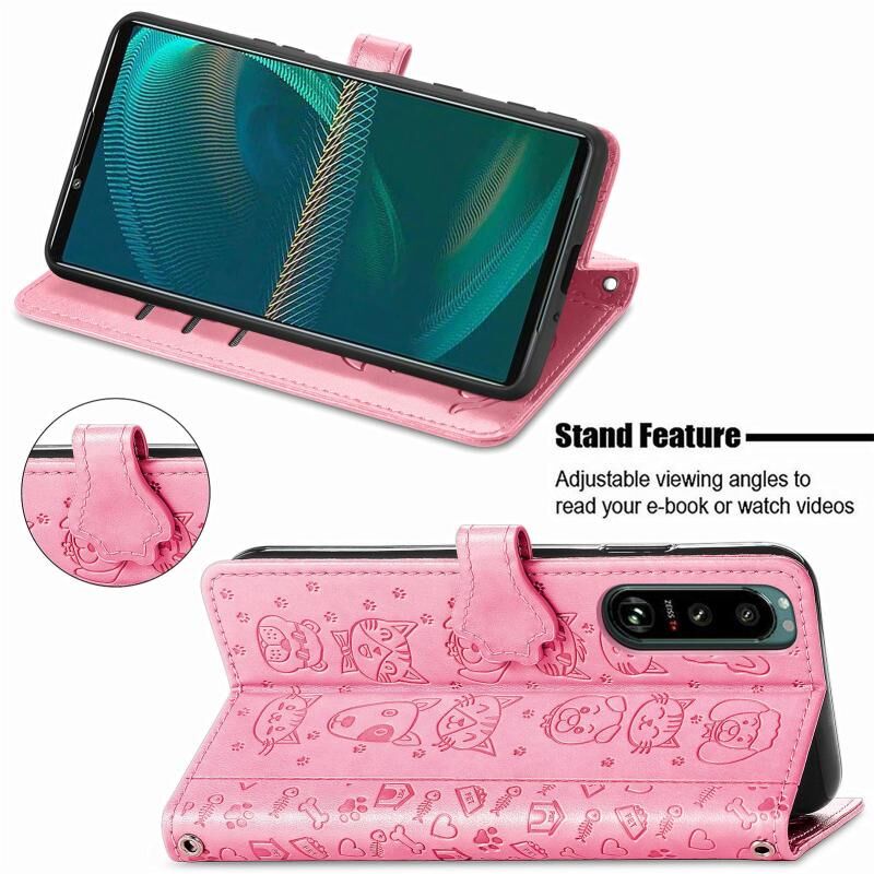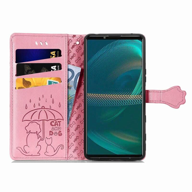 Θήκη τηλεφώνου από δέρμα με ανάγλυφο σχέδιο γάτας και σκύλου για Sony Xperia 5 IV (Κίτρινο)