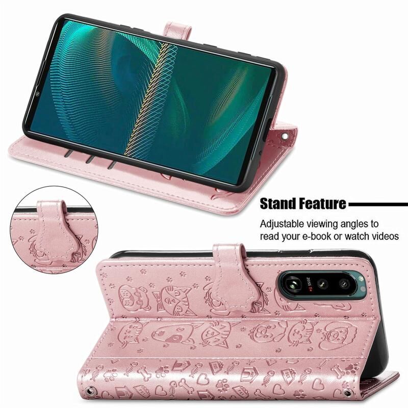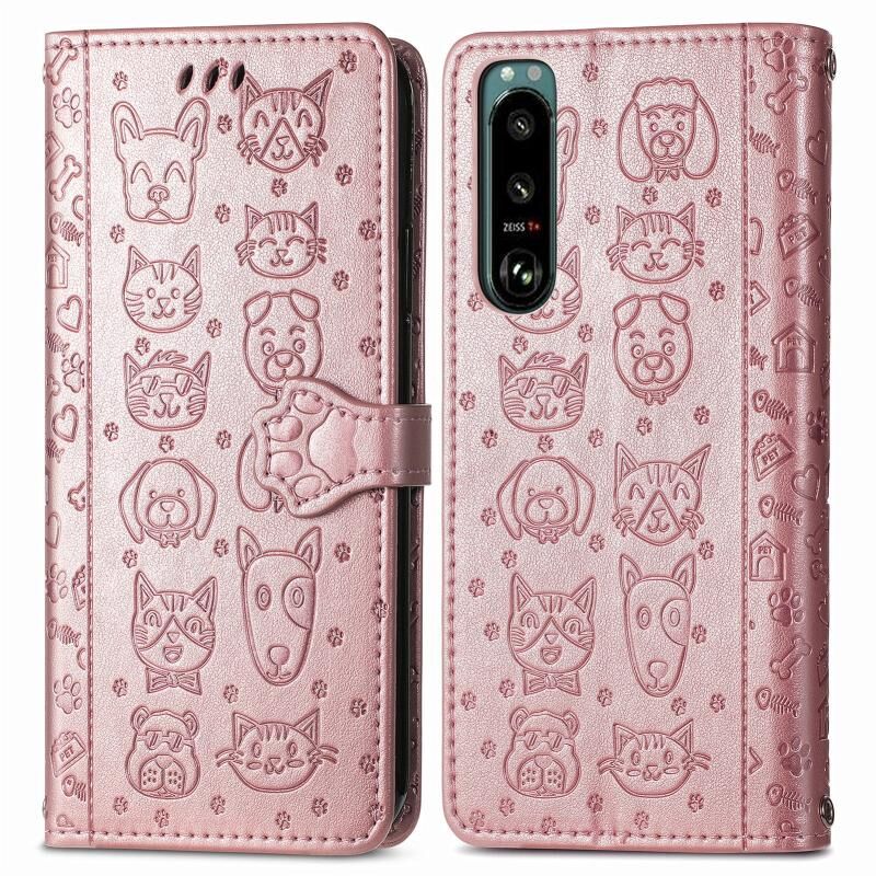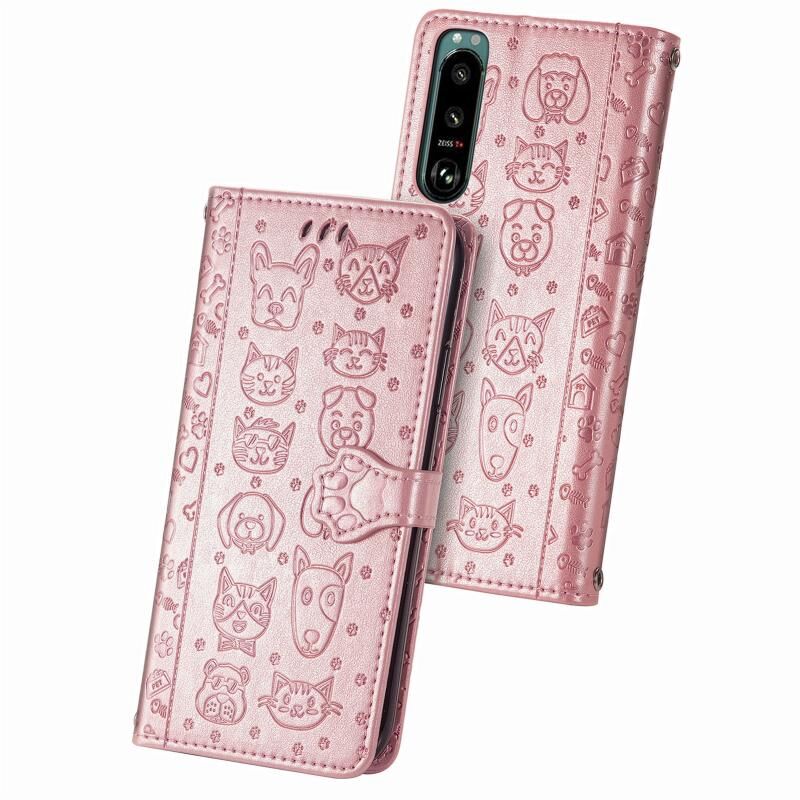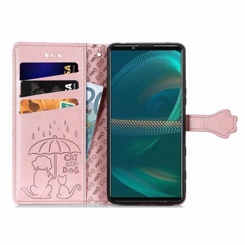 Θήκη τηλεφώνου από δέρμα με ανάγλυφο σχέδιο γάτας και σκύλου για Sony Xperia 5 IV (Κίτρινο)