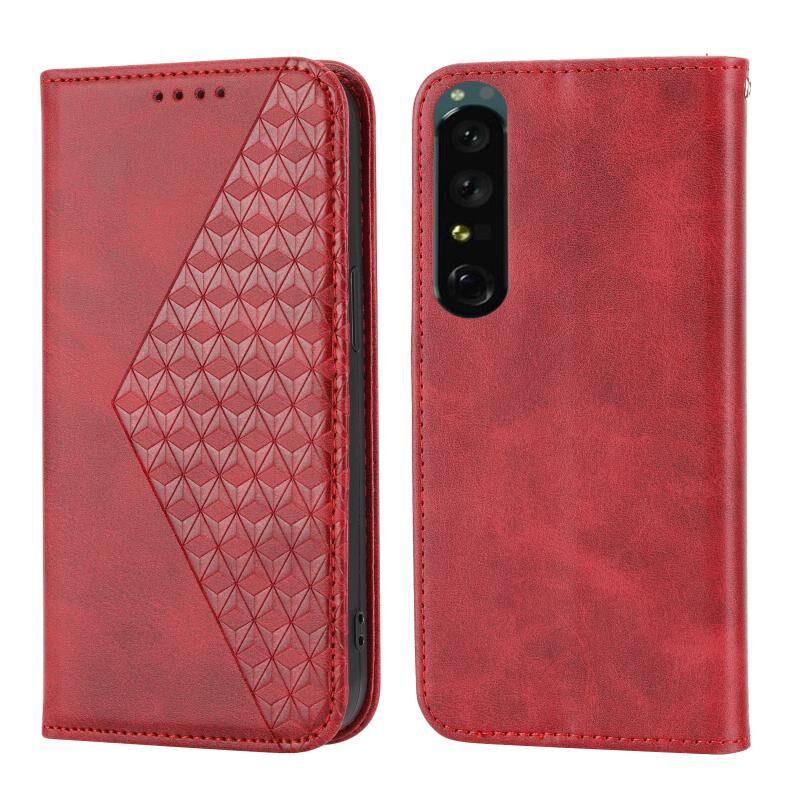 Θήκη τηλεφώνου από μαγνητικό δέρμα με υφή μοσχαριού Cubic Grid για Sony Xperia 5 IV (Κόκκινο)