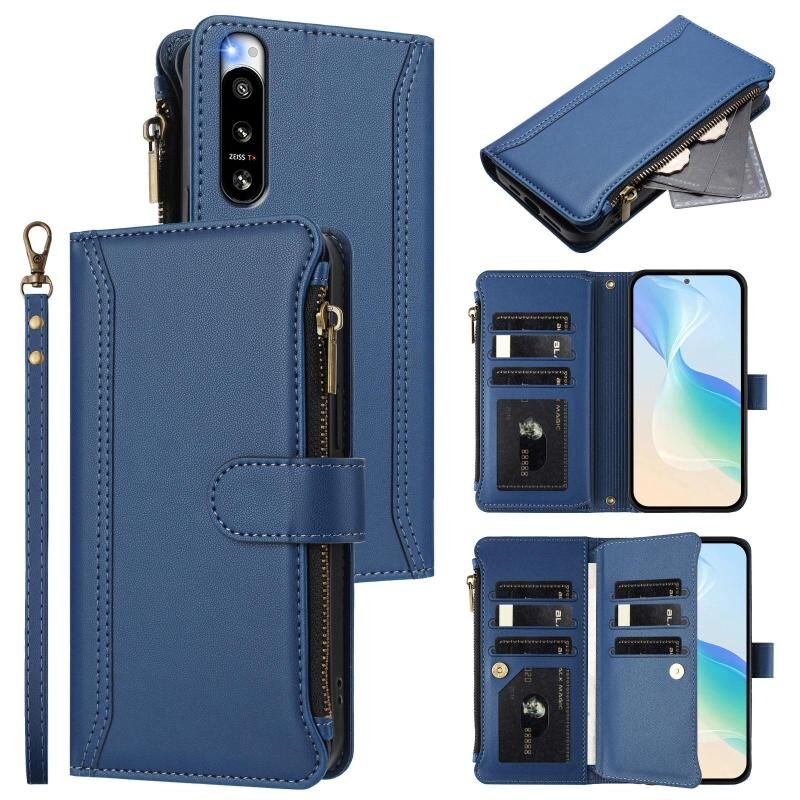 For Sony Xperia 5 IV Magnetic Closure 9 Card Slots Zipper Leather Case with Hand Strap(Dark Blue)