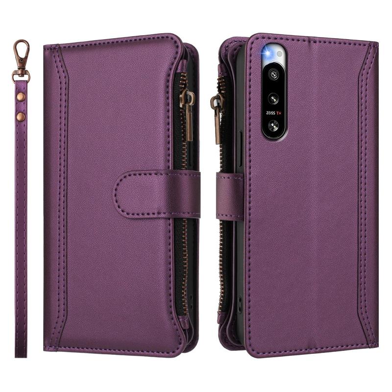 For Sony Xperia 5 IV Magnetic Closure 9 Card Slots Zipper Leather Case with Hand Strap(Purple)