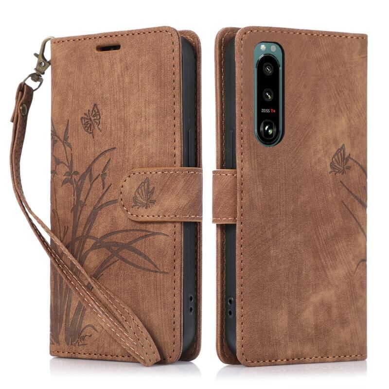 Θήκη τηλεφώνου από δέρμα με ανάγλυφο σχέδιο πεταλούδας ορχιδέας για Sony Xperia 5 IV (Μαύρο)