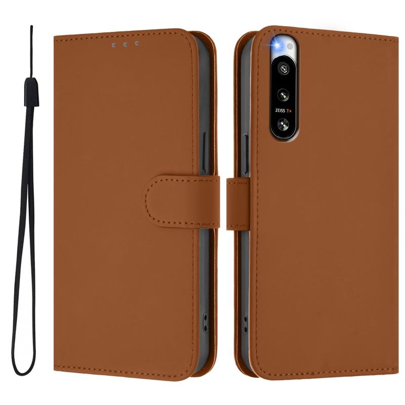 For Sony Xperia 5 IV Skin Feel Solid Color Leather Phone Case with Lanyard(Brown)