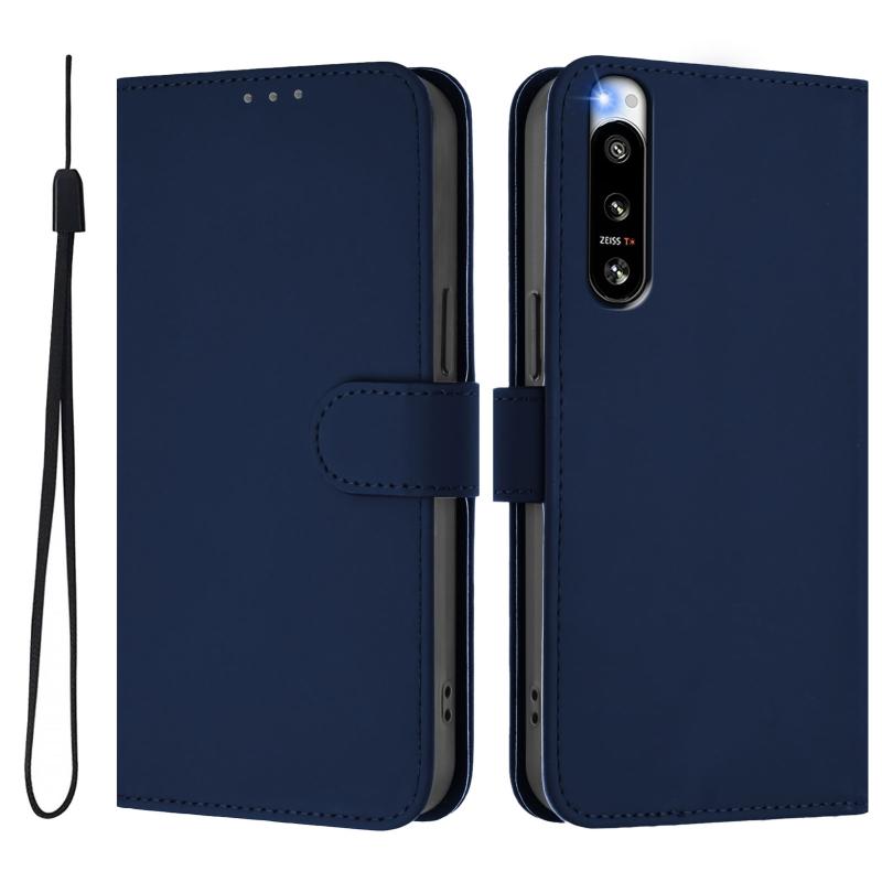 For Sony Xperia 5 IV Skin Feel Solid Color Leather Phone Case with Lanyard(Navy Blue)