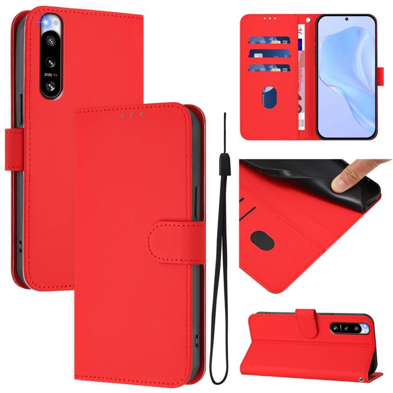 For Sony Xperia 5 IV Skin Feel Solid Color Leather Phone Case with Lanyard(Red)