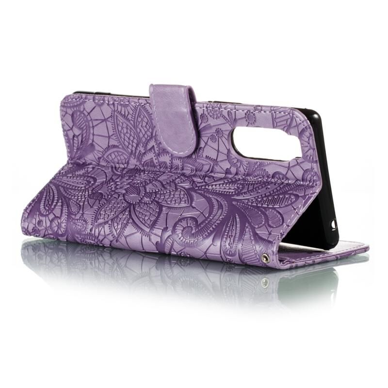 Για το Sony Xperia 5 Lace Flower οριζόντια Flip δερμάτινη θήκη με θήκη για κάρτες & υποδοχές & πορτοφόλι & κορνίζα φωτογραφιών (μωβ)