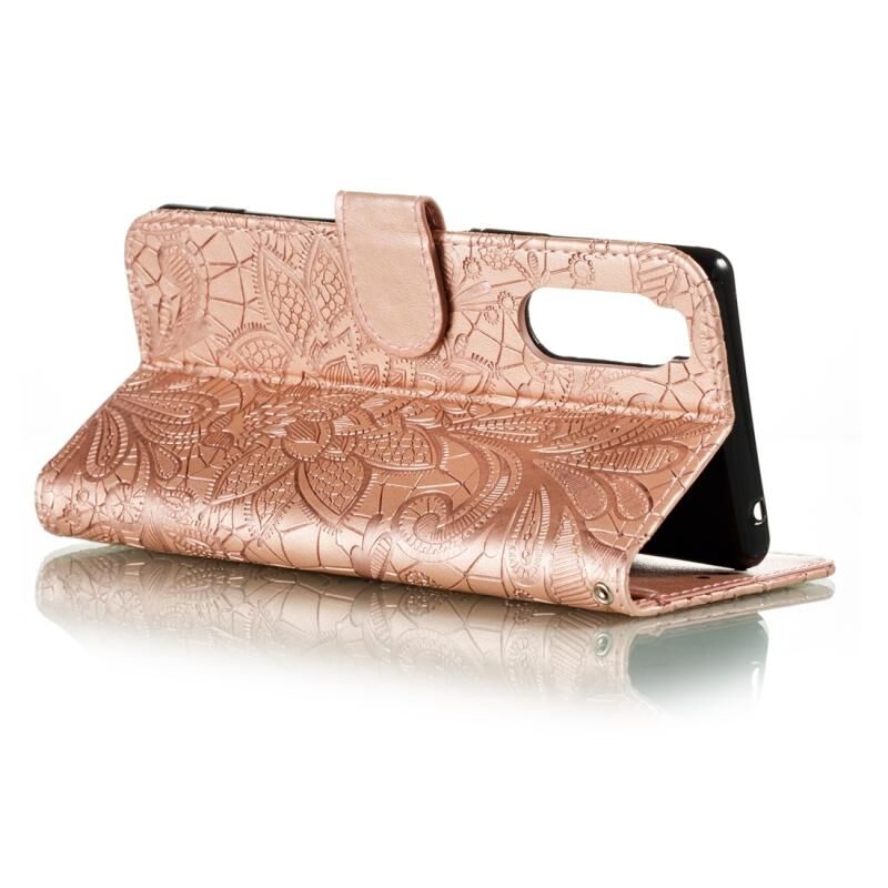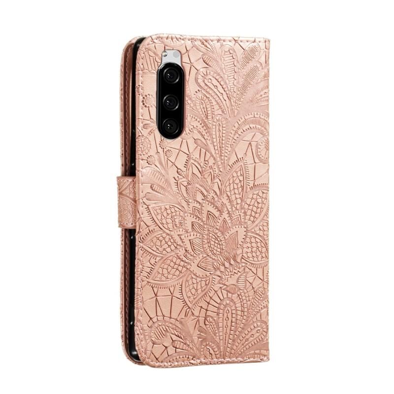 Για Sony Xperia 5 Lace Flower Οριζόντια Flip δερμάτινη θήκη με θήκη για κάρτες & υποδοχές & πορτοφόλι & κορνίζα φωτογραφιών(Rose Gold)