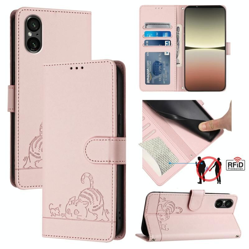 Θήκη τηλεφώνου από δέρμα με ανάγλυφο σχέδιο γάτας και ποντικού για Sony Xperia 5 V 2023 με προστασία RFID και κορδόνι (Μέντας Πράσινο)