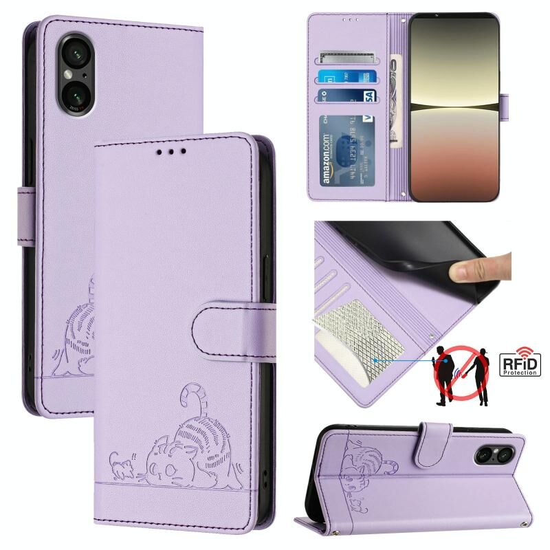 Θήκη τηλεφώνου από δέρμα με ανάγλυφο σχέδιο γάτας και ποντικού για Sony Xperia 5 V 2023 με προστασία RFID και κορδόνι (Μέντας Πράσινο)