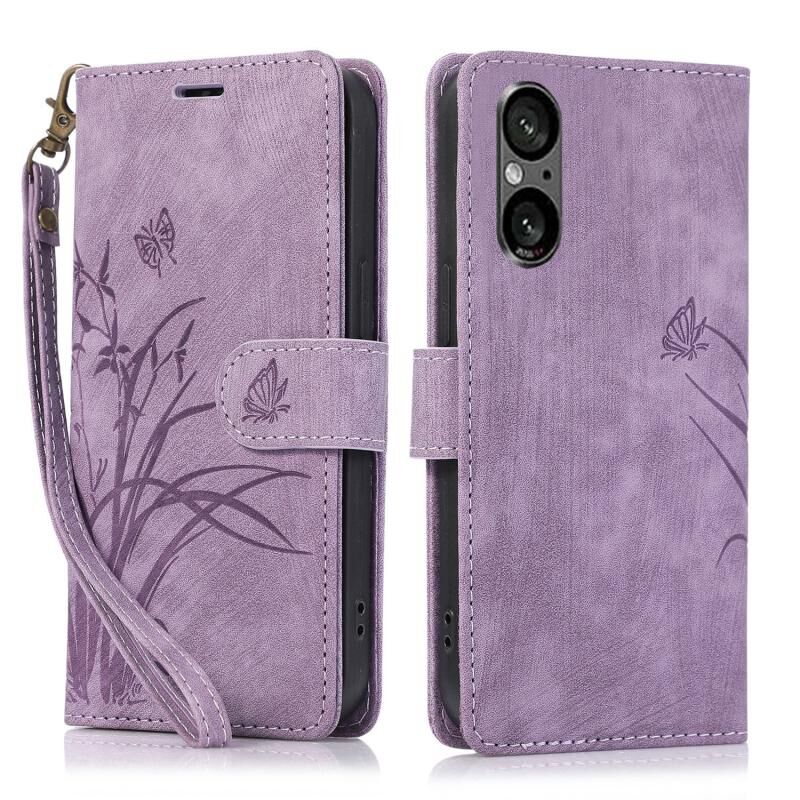 Θήκη τηλεφώνου από δέρμα με ανάγλυφο σχέδιο πεταλούδας ορχιδέας για Sony Xperia 5 V 5G (Μαύρο)
