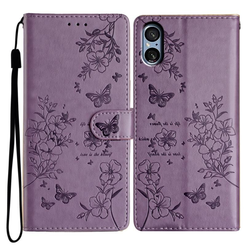 Θήκη τηλεφώνου από δέρμα για Sony Xperia 5 V, με σχέδια πεταλούδες και λουλούδια (Μαύρο)
