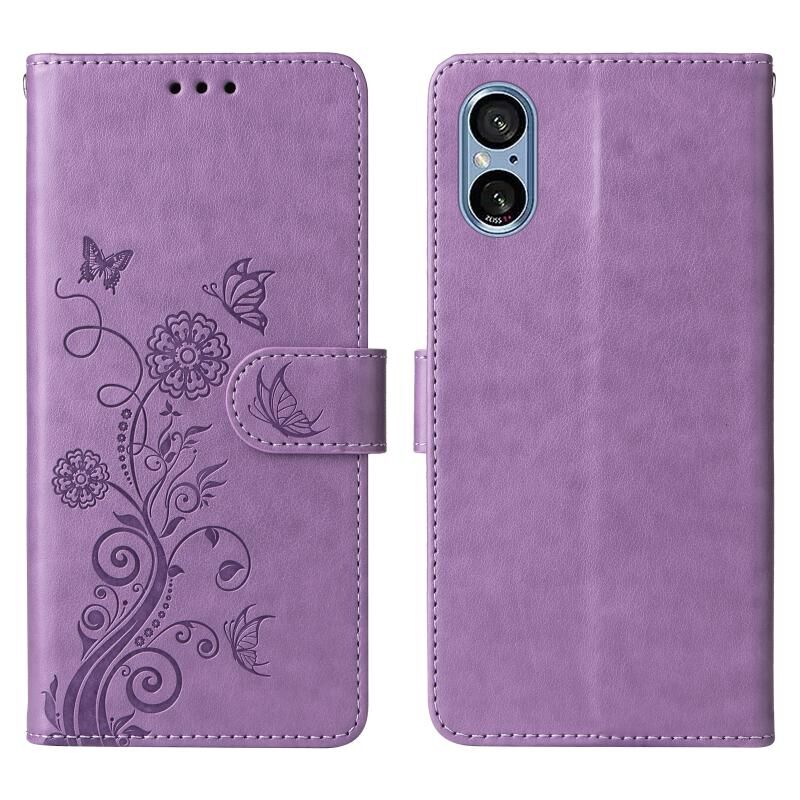 Θήκη τηλεφώνου δερμάτινη με ανάγλυφα λουλούδια πεταλούδας για Sony Xperia 5 V (Μωβ)
