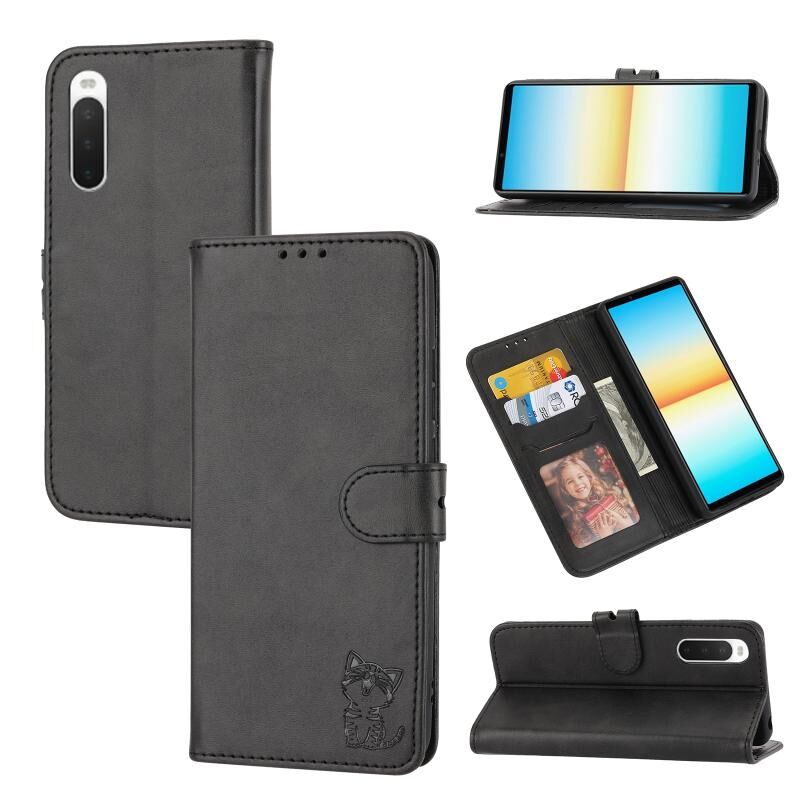 Για το Sony Xperia 5 V ανάγλυφο Happy Cat μοτίβο Flip δερμάτινη θήκη τηλεφώνου (μαύρο)