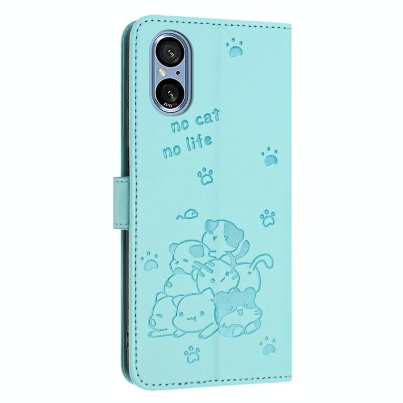 Θήκη δερμάτινη για Sony Xperia 5 V με ανάγλυφο γατάκι και κορδόνι (Μωβ)