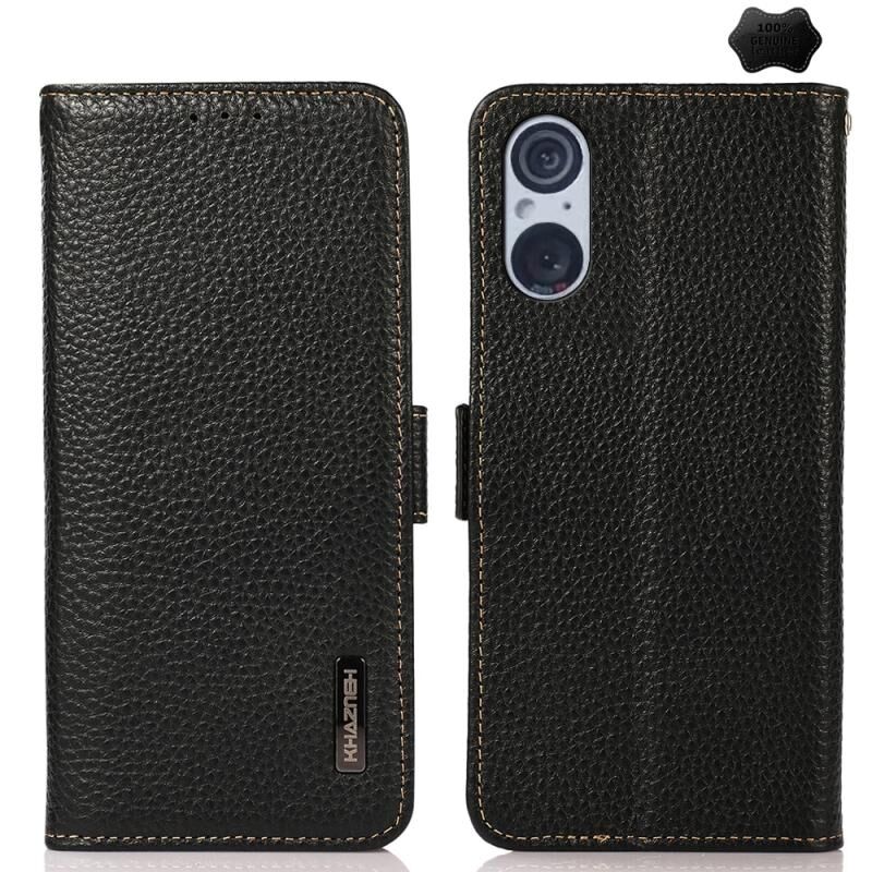 Θήκη KHAZNEH με μαγνητικό κλείσιμο, από γνήσιο δέρμα Litchi, με προστασία RFID για Sony Xperia 5 V (Μαύρο)