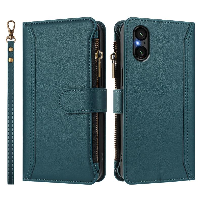 For Sony Xperia 5 V Magnetic Closure 9 Card Slots Zipper Leather Case with Hand Strap(Dark Green)