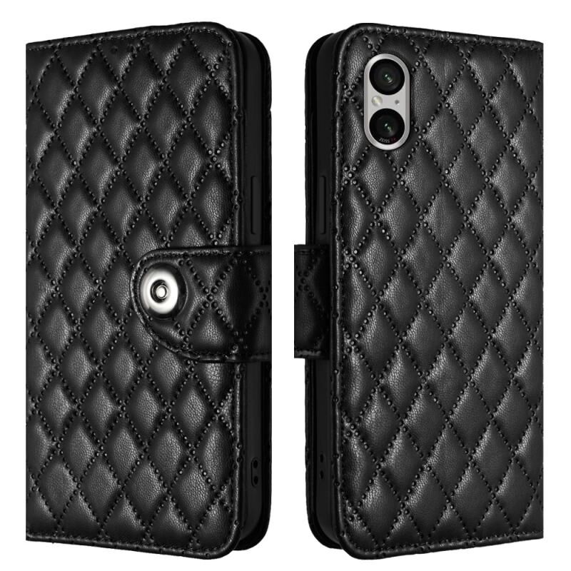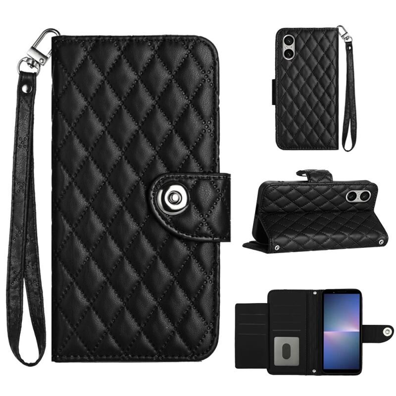 Για το Sony Xperia 5 V Rhombic Texture Flip δερμάτινη θήκη τηλεφώνου με κορδόνι (μαύρο)