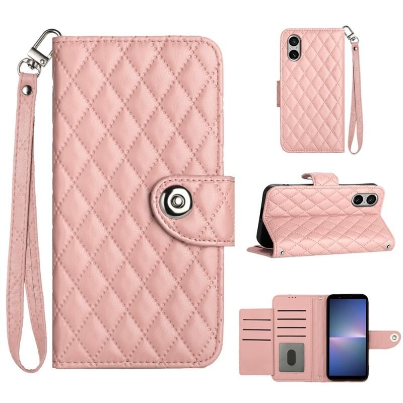 Για το Sony Xperia 5 V Rhombic Texture Flip δερμάτινη θήκη τηλεφώνου με κορδόνι (ροζ κοραλλί)
