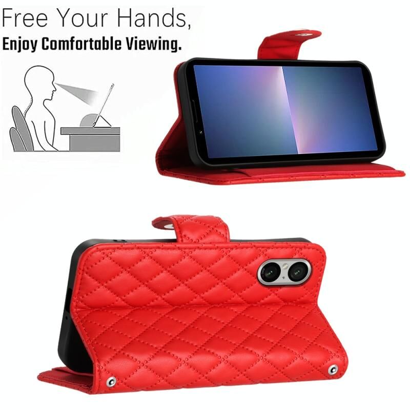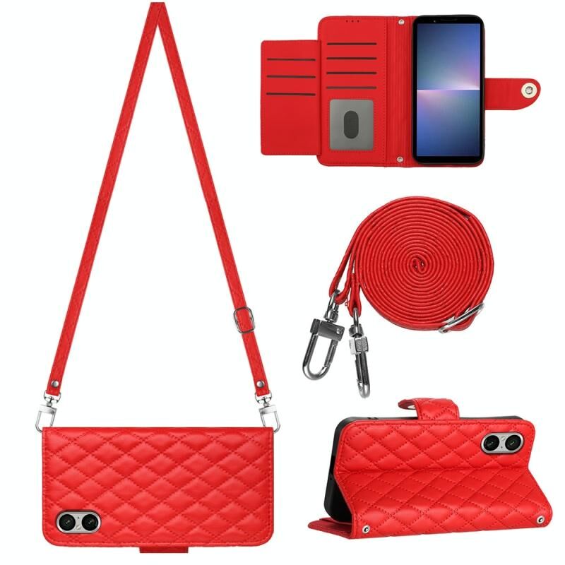 Για το Sony Xperia 5 V Rhombic Texture Flip δερμάτινη θήκη τηλεφώνου με μακρύ κορδόνι (κόκκινο)