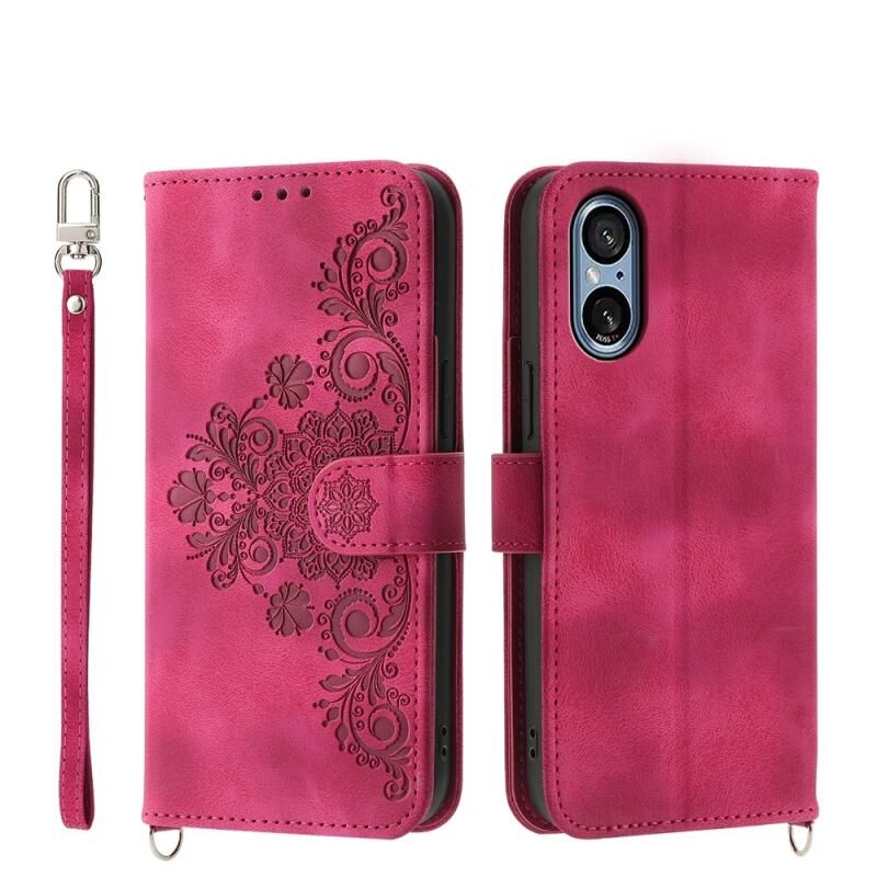 Για Sony Xperia 5 V Skin-feel λουλούδια ανάγλυφο πορτοφόλι δερμάτινη θήκη τηλεφώνου (κόκκινο κρασί)