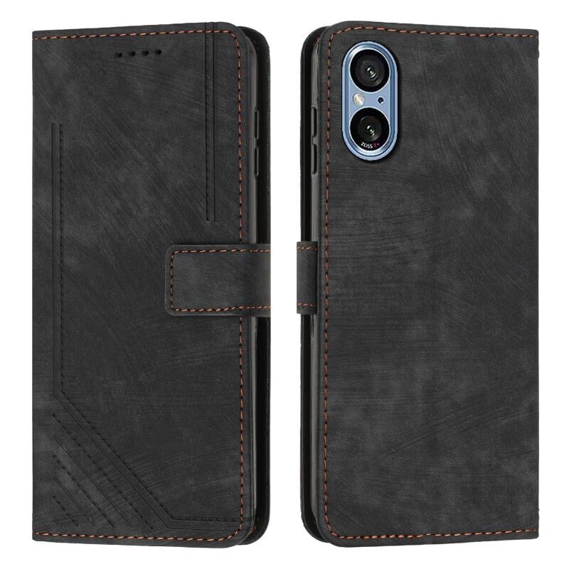 Για το Sony Xperia 5 V Skin Feel Stripe Pattern δερμάτινη θήκη τηλεφώνου με κορδόνι (Μαύρο)