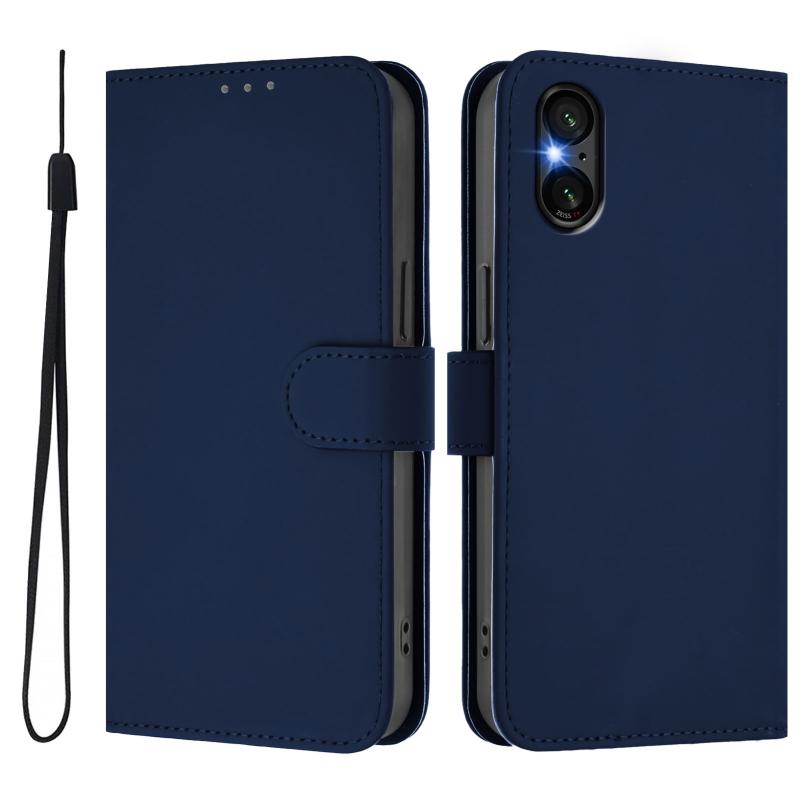 For Sony Xperia 5 VI 2024 Skin Feel Solid Color Leather Phone Case with Lanyard(Navy Blue)