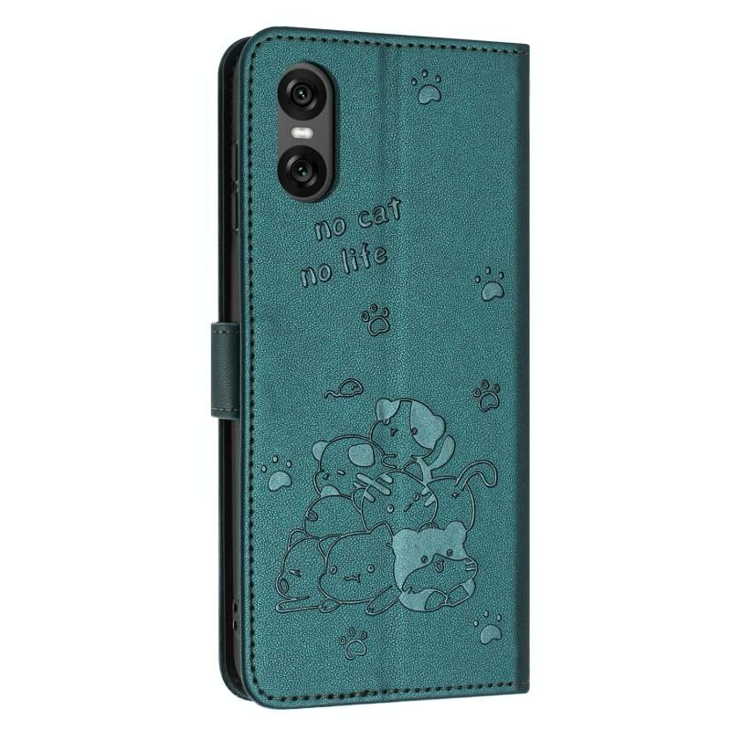 Θήκη δερμάτινη για Sony Xperia 5 VI με ανάγλυφο γατάκι και κορδόνι (Μωβ)