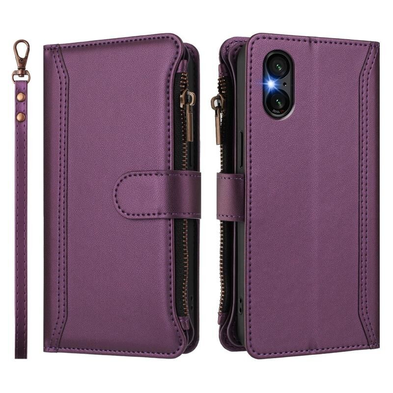 For Sony Xperia 5 VI Magnetic Closure 9 Card Slots Zipper Leather Case with Hand Strap(Purple)